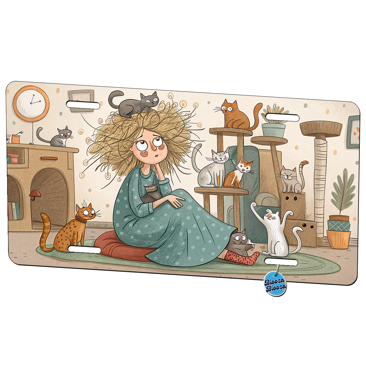 Cartoon of Crazy Cat Lady Home Metal Vanity Novelty Tag License Plate for Trucks Cars SUVs
