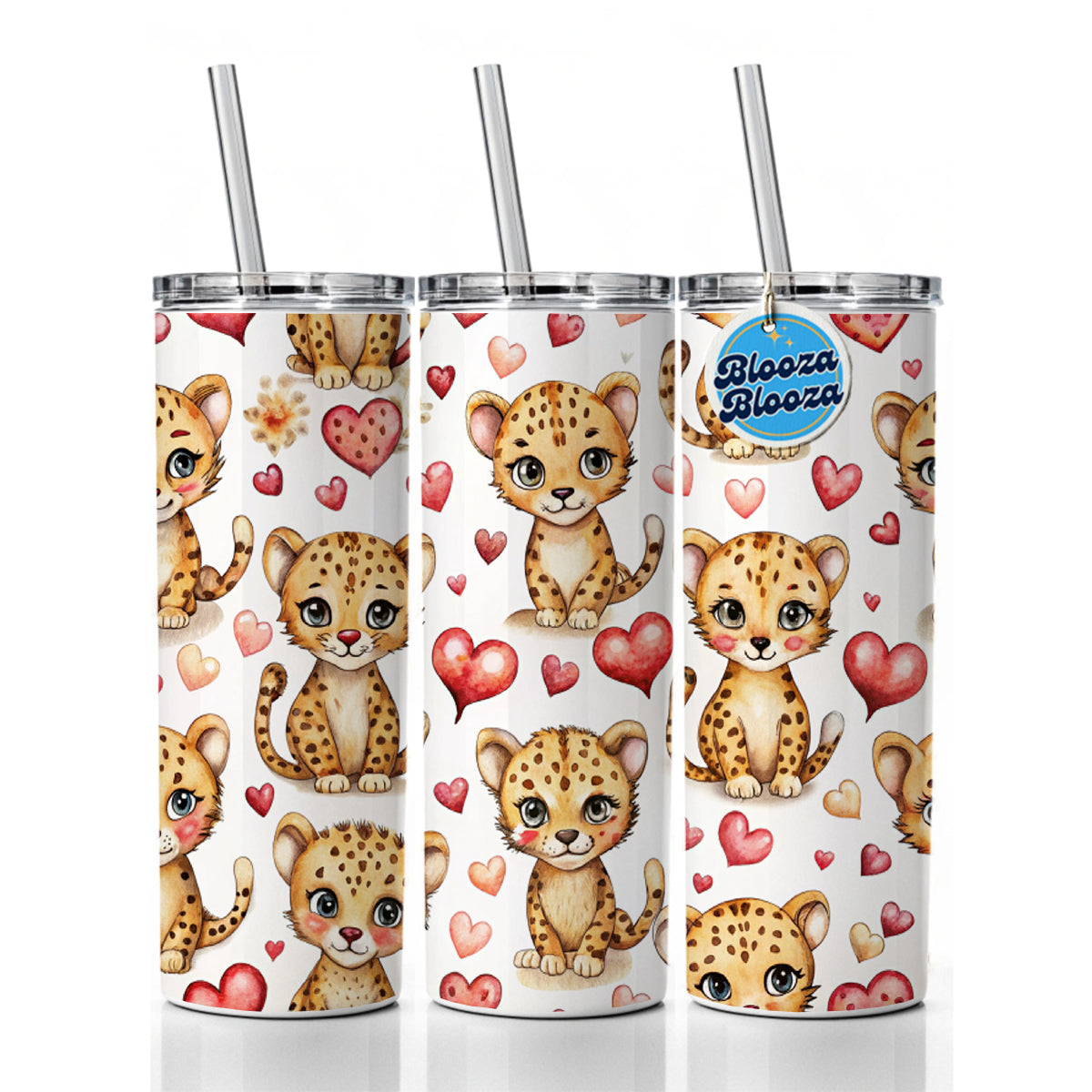 Cute Cheetahs Hearts Watercolor Skinny Tumbler 20oz with Straw Insulated Water Bottle Gift