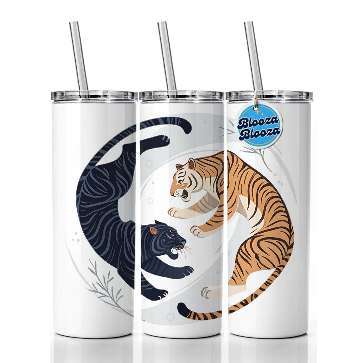 Two Tigers Yin Yang Illustration Skinny Tumbler 20oz with Straw Insulated Water Bottle Gift