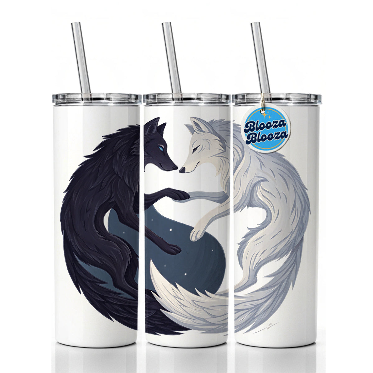 Two Wolves Yin Yang Black White Skinny Tumbler 20oz with Straw Insulated Water Bottle Gift